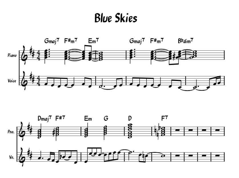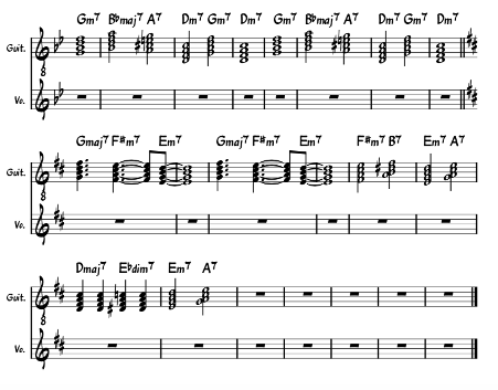 This is also a common technique used in Ted Greene’s guitar arrangements to move from one key to the next, and functions well on guitar as the chords can all be found in similar boxes to one another. This allows me to voice lead a melody, similar to that in ‘Paper Aeroplane,’ for the purpose of adding interest to the chords with other tones. The chord progression has a similar form to a jazz standard, with an A and a B section, differentiated by the key signature marking, between G minor and D major.