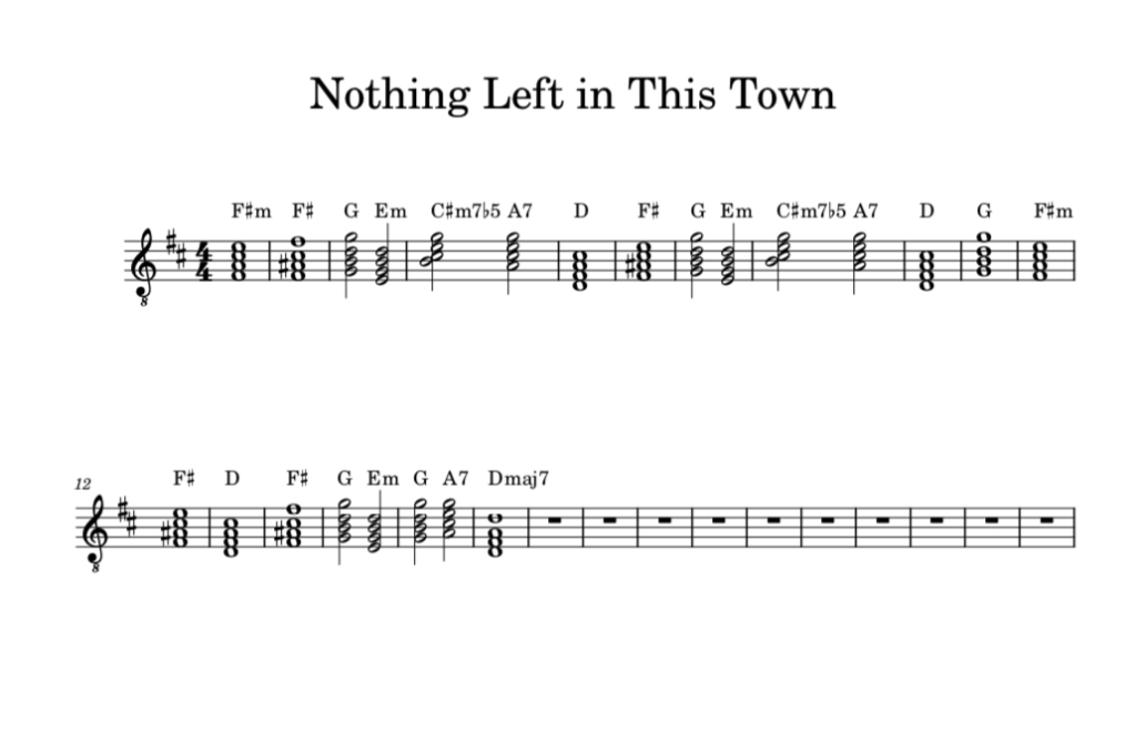 Thematically, this track deals with the anxiety of finding the next place to belong once everything behind you is starting to disappear. I used lots of open chords to experiment with less definite major and minor sounds, the suspense reflecting the subject matter. The tag line from the chorus is over the most common pop chord progression, the IV-V-I, which carries many styles, including blues and country.